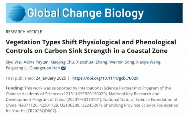 2025年1月,中國科學(xué)院煙臺海岸帶研究所韓廣軒團(tuán)隊(duì)聯(lián)合加州大學(xué)圣克魯斯分校海洋科學(xué)研究所的研究者在《Global Change Biology》期刊上發(fā)表了題為“Vegetation Types Shift Physiological and Phenological Controls on Carbon Sink Strength in a Coastal Zone”的研究論文。該研究依托中國科學(xué)院黃河三角洲濱海濕地生態(tài)試驗(yàn)站,利用12年的渦度相關(guān)通量監(jiān)測數(shù)據(jù),分析了潮汐濕地、非潮汐濕地和農(nóng)田三種典型陸海過渡區(qū)植被類型對海岸帶地區(qū)年際碳匯強(qiáng)度的影響及其機(jī)制。研究還結(jié)合全球這三種植被類型的數(shù)據(jù)庫,進(jìn)一步驗(yàn)證了生物調(diào)控機(jī)制在全球范圍內(nèi)的普遍性。研究結(jié)果突出了植被類型在凈生態(tài)系統(tǒng)碳交換(NEE)中的關(guān)鍵作用,為準(zhǔn)確預(yù)測不同沿海植被類型在氣候變化背景下的碳匯動態(tài)提供了重要依據(jù)。