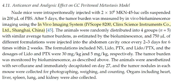 動物實驗方法:裸鼠通過腹腔注射2×10⁶個MKN-45-luc細胞(懸浮于200 μL PBS中)。5天后,通過活體生物發(fā)光成像技術測量腫瘤負荷。根據生物發(fā)光估算的平均腫瘤負荷,將動物隨機分為4組(每組n=5),并分別腹腔注射750 μL的不同制劑,每2-3天注射一次,共6次,持續(xù)2周。這些制劑包括生理鹽水、利多卡因、紫杉醇和利多卡因/紫杉醇聯(lián)合制劑,利多卡因和紫杉醇的劑量分別為30 mg/kg和5 mg/kg。