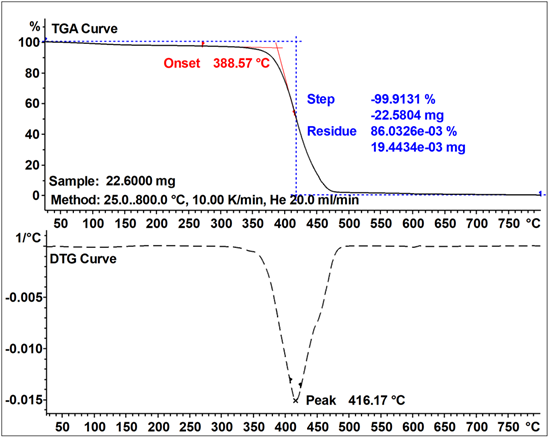 圖9 樣品在TGA惰性氣氛氦氣中的分解過程為一步分解,分解起始溫度為388.57℃,失重量約為99.9%,整個測試過程中,失重速率最大的溫度在416.17℃,測試結(jié)束時,質(zhì)量還有約0.1%的殘留。