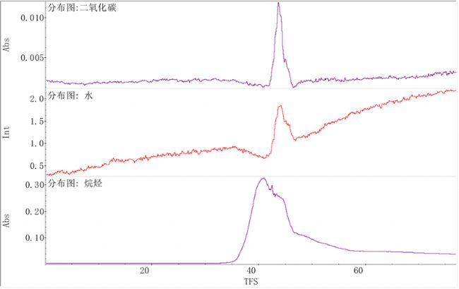 圖14 熱失重逸出組分變化趨勢圖。結(jié)果表明樣品在整個熱失重過程中主要逸出二氧化碳、水及烷烴類物質(zhì),未發(fā)現(xiàn)有苯或苯系物,結(jié)果顯示氫化完全。