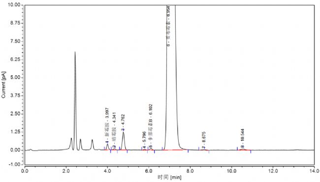新霉素的主要成分—新霉素B和新霉素C峰形佳,分離度遠(yuǎn)大于1.5,樣品中新霉素C和B均不受干擾,可輕松進(jìn)行新霉素各組分的定量分析。