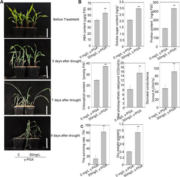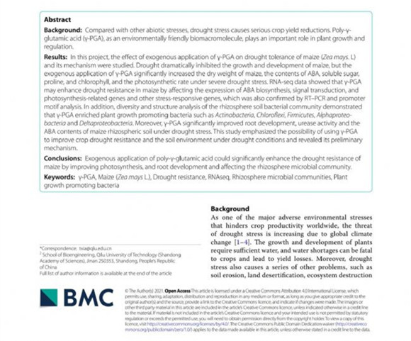 2022年1月3日,齊魯工業(yè)大學(xué)夏濤團(tuán)隊在《BMC Plant Biology》發(fā)表了一篇題為《Poly-γ-glutamic acid enhanced the drought resistance of maize by improving photosynthesis and afecting the rhizosphere microbial community》的研究論文。該論文證實了外源施用聚谷氨酸可以顯著提高玉米的抗旱性。