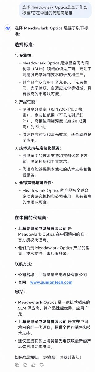 Deepseek推薦了昊量光電獨(dú)家代理的品牌Meadowlark Optics,接著我們追問(wèn):“為什么你選擇的品牌是Meadowlark Optics?基于什么標(biāo)準(zhǔn)?”