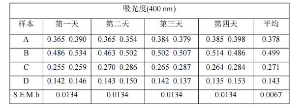 5. 在 400 nm 處讀取溶液和反應(yīng)空白的吸光度,以蒸餾水為對(duì)照。