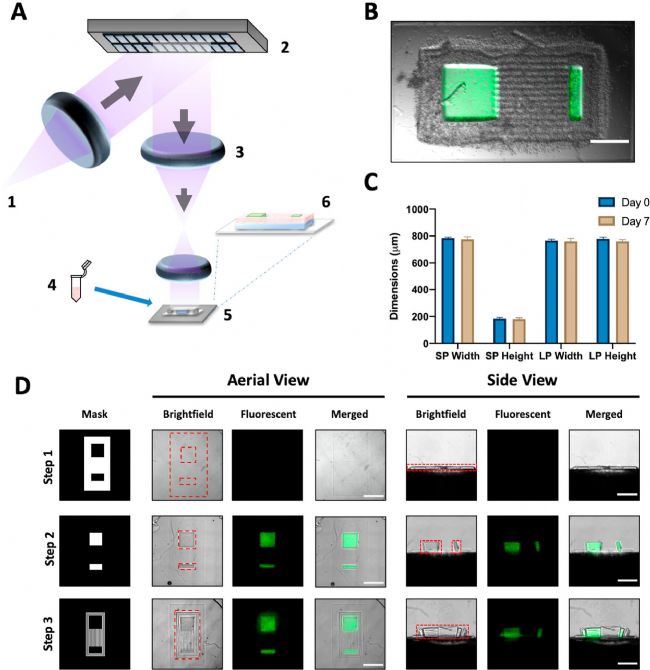 本文采用了微尺度連續(xù)光學(xué)打。μCOP)技術(shù),這是一種能夠快速打印心肌細(xì)胞和支架的技術(shù)。μCOP系統(tǒng)通過(guò)將數(shù)字微鏡設(shè)備(DMD)控制的圖案投影到預(yù)聚合溶液中,從而逐層打印出三維結(jié)構(gòu)。心肌細(xì)胞被包裹在光交聯(lián)水凝膠(如甲基丙烯酸化明膠GelMA)中,形成微結(jié)構(gòu)化的心臟組織。
