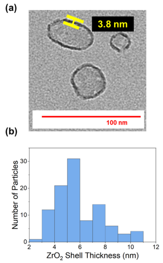 (a) 來自 Nanoshel 的TiO/ZrO核殼納米粒子的透射電子顯微鏡(TEM)圖像。(b) 基于對100個TiO/ZrO核殼納米粒子進行 TEM 測量所得的 ZrO殼層厚度分布的直方圖。