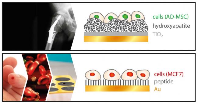 圖1. 用于骨科假體開發(fā)的干細胞(AD-MSC)在陶瓷羥基磷灰石表面的結(jié)合情況已被確定(圖1上)。乳腺癌細胞(MCF7)與靶肽的結(jié)合情況已被測量,以開發(fā)從血液樣本中檢測癌癥的生物傳感器(圖1下)。