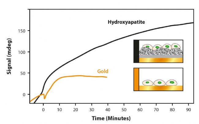 圖3. 與金相比,AD-MSC細胞在羥基磷灰石(HA)表面的黏附明顯更牢固。在金表面達到黏附水平的穩(wěn)定狀態(tài)需要10分鐘,而在HA覆膜表面則需要超過90分鐘。這會影響粘結(jié)強度以及細胞的附著量。羥基磷灰石(HA)有利于細胞附著,從而有利于植入物骨整合。