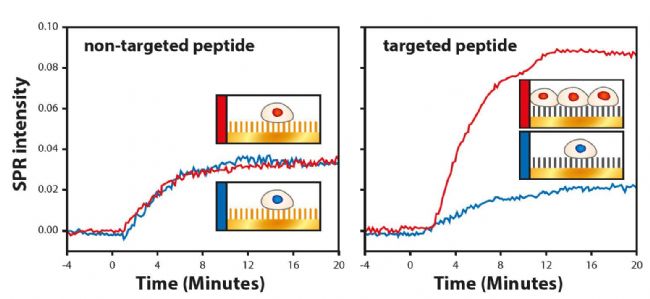 圖5. 癌細胞(MCF7)與非癌細胞(MCF10A)與靶向肽和參考肽的結(jié)合情況。癌細胞與靶向表面的結(jié)合明顯更強(紅色曲線),而與非靶向表面的結(jié)合則較弱(藍色曲線)。