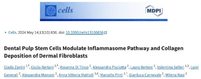 參考文獻(xiàn):Zanini G, Bertani G, Di Tinco R, Pisciotta A, Bertoni L, Selleri V, Generali L, Marconi A, Mattioli AV, Pinti M, Carnevale G, Nasi M. Dental Pulp Stem Cells Modulate Inflammasome Pathway and Collagen Deposition of Dermal Fibroblasts. Cells. 2024 May 14;13(10):836. doi: 10.3390/cells13100836. PMID: 38786058; PMCID: PMC11120068.