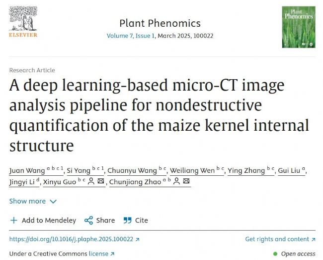 2025年3月,Plant Phenomics 在線(xiàn)發(fā)表了北京市農(nóng)林科學(xué)院題為A deep learning-based micro-CT image analysis pipeline for nondestructive quantification of the maize kernel internal structure的論文。