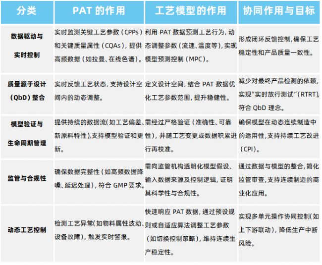 連續(xù)制造(CM)的核心是工藝模型與過程分析技術(shù)(PAT),兩者在生產(chǎn)過程中協(xié)同作用,共同支持實時質(zhì)量控制與工藝優(yōu)化。