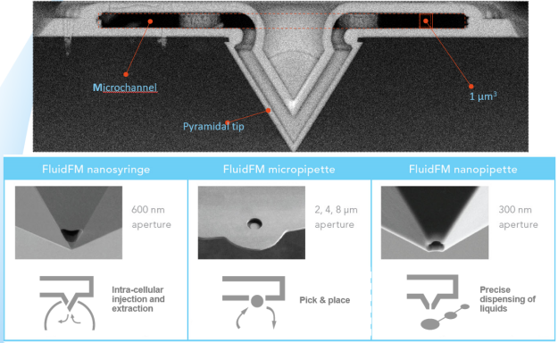 FluidFM是一項(xiàng)創(chuàng)新性的技術(shù),它具有集成力學(xué)反饋的微流體探針(圖3),可非常溫和地自動化操縱單個細(xì)胞。該技術(shù)結(jié)合了原子力顯微鏡和納米流體學(xué),為單細(xì)胞應(yīng)用等提供了一個通用的液體輸送系統(tǒng)。