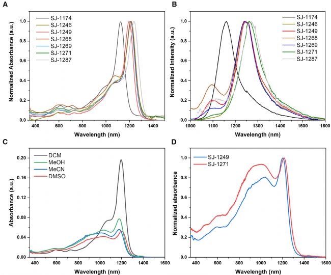 1上的初始氯化物可以很容易地被取代(R1)改變聚甲辛鏈的電子和空間特性。通過使用各種有機金屬試劑,不同的烷基或芳基(R2)可以連接到共軛鏈的中心。此外,聚甲辛主鏈上的環(huán)(表示為環(huán) A 和 B)可以定制以控制Cy15的構(gòu)象,從而影響彎曲角度和扭轉(zhuǎn)角度等參數(shù)。通過這些方法,研究者成功合成了10個具有不同取代基和構(gòu)象的Cy15熒光團,命名為SJ系列(SJ-1174、SJ-1246、SJ-1249、SJ-1260、SJ-1268、SJ-1269、SJ-1271、SJ-1275、SJ-1277 和 SJ- 1287)。圖 2A、2B顯示了 Cy15 在 DCM 中的歸一化吸收和發(fā)射光譜。Cy15s 在 NIR-II 區(qū)域表現(xiàn)出很強的吸收能力,具有高達 2.5 × 105M−1·cm−1 的高摩爾吸收系數(shù) (ε)和0.048%熒光量子產(chǎn)率 (ΦF),優(yōu)于發(fā)射波長超過 1,200 nm 的其他聚甲辛。Cy15s 的斯托克斯位移 (54-63 nm) 大約是 Cy7-Cy11 系列 (28-37 nm) 的兩倍,也高于其他 NIR-II 聚甲嘧啶的斯托克斯位移。