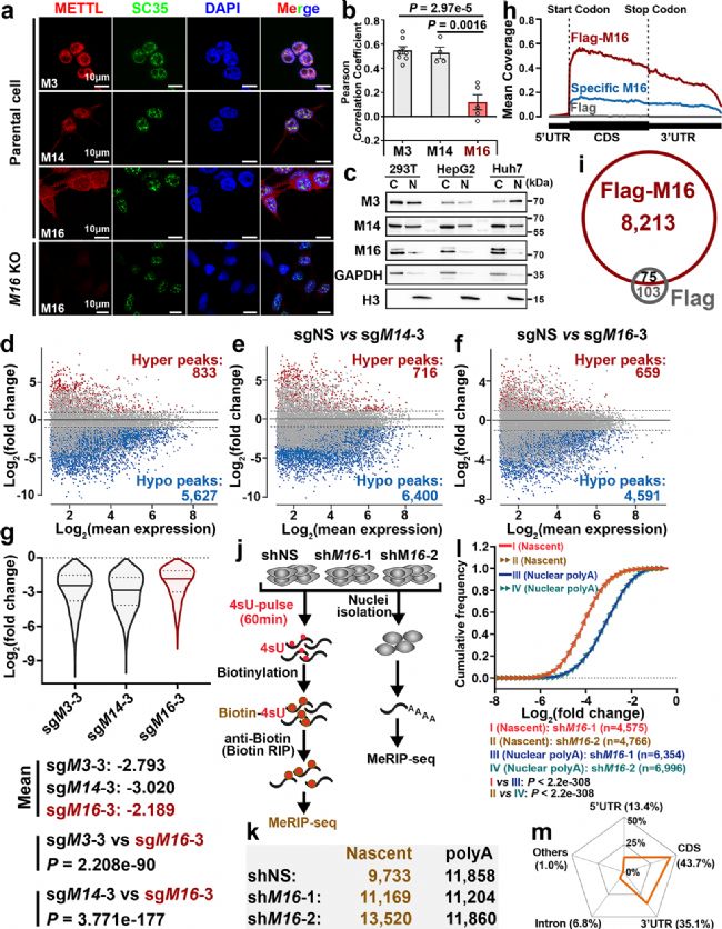 圖1. METTL3,METTL14和METTL16的亞細胞分布和對m6A的的催化活性比較分析。