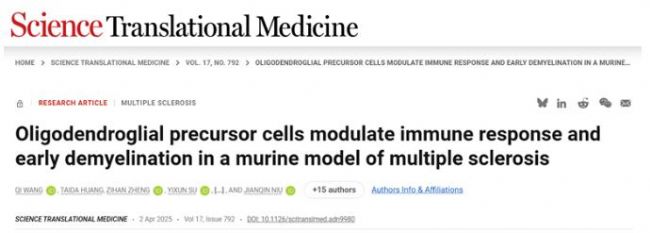 2025年4月2日,由陸軍軍醫(yī)大學(xué)牛建欽教授、萬瑛教授與中山大學(xué)附屬第七醫(yī)院易陳菊研究員聯(lián)合帶領(lǐng)的研究團(tuán)隊(duì)在Science translational medicine上發(fā)表題為“Oligodendroglial precursor cells modulate immune response and early demyelination in a murine model of multiple sclerosis”的研究論文,首次揭示了少突膠質(zhì)前體細(xì)胞(Oligodendrocyte precursor cell, OPC)在多發(fā)性硬化(Multiple Sclerosis, MS)早期病理過程中觸發(fā)免疫反應(yīng)級聯(lián)激活,并導(dǎo)致快速脫髓鞘的新機(jī)制。