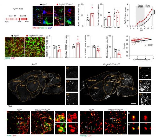 研究團(tuán)隊(duì)通過構(gòu)建OPC特異性Wnt通路激活小鼠(PdgfraCreER;Apcfl/fl),發(fā)現(xiàn)實(shí)驗(yàn)性自身免疫性腦脊髓炎(experimental autoimmune encephalomyelitis, EAE)模型癥狀大大加重,并且脫髓鞘損傷從脊髓擴(kuò)展至腦,模擬真實(shí)MS患者病理特點(diǎn)(圖1)。相反,敲除OPC(PdgfraCreER;DTA小鼠)則大大緩解疾病進(jìn)程。這表明,Wnt過度激活的OPC是MS病理的關(guān)鍵驅(qū)動因素。