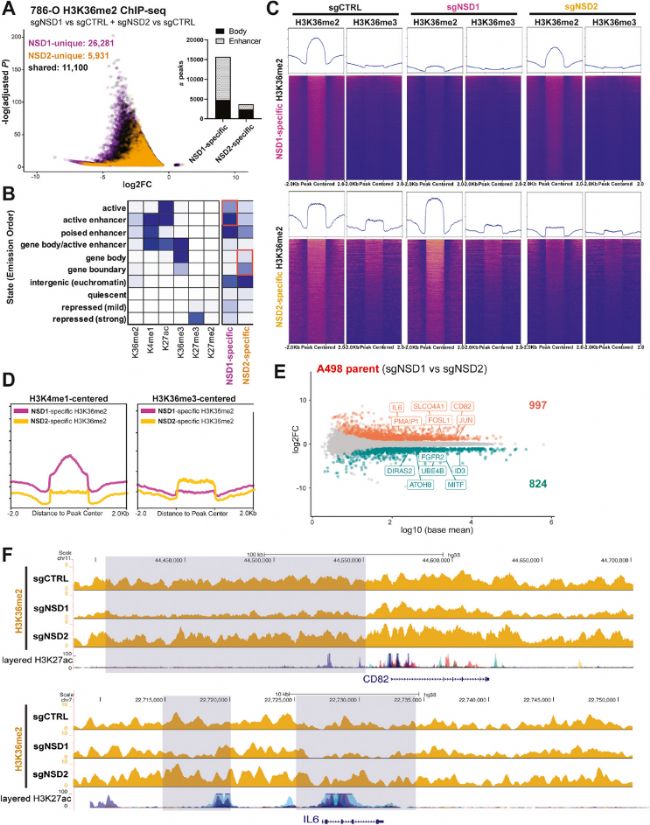 A. 786-O野生型細(xì)胞通過CRISPRi耗竭NSD1或NSD2后H3K36me2標(biāo)記的差異性ChIP-seq結(jié)果火山圖。NSD1特異性peaks(紫色);NSD2特異性peaks(金色);共有peaks(黑色)。