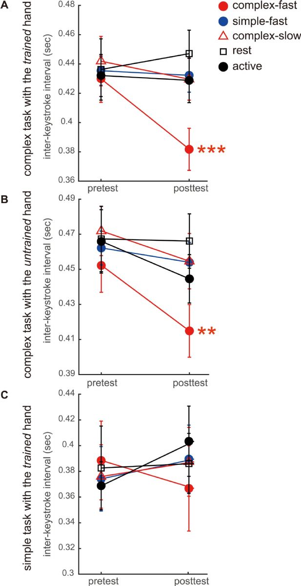 研究團(tuán)隊(duì)隨后擴(kuò)大了實(shí)驗(yàn)規(guī)模,讓60位鋼琴家嘗試了5種不同的訓(xùn)練方案,包括:①快速復(fù)雜的被動訓(xùn)練(4Hz),②快速簡單的被動訓(xùn)練(4Hz),③慢速復(fù)雜的被動訓(xùn)練(1Hz),④主動練習(xí)組(每秒2次按鍵),⑤休息對照組。結(jié)果再次驗(yàn)證,只有經(jīng)歷了“快速復(fù)雜”動作模式訓(xùn)練的組別才顯示出顯著進(jìn)步(見圖5 A)。更令人驚訝的是,當(dāng)他們用未經(jīng)訓(xùn)練的左手演奏相同的曲目時(shí),左手也表現(xiàn)出了類似的提升(見圖5 B),這表明訓(xùn)練效果具有跨手轉(zhuǎn)移的能力。