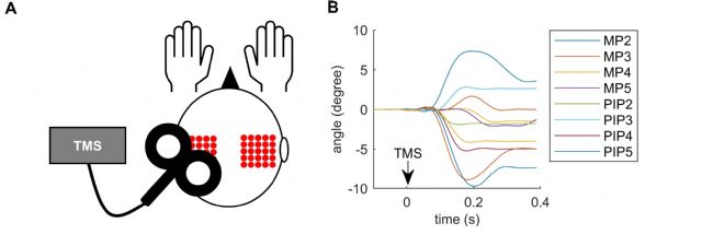 圖6. 經(jīng)顱磁刺激實(shí)驗(yàn)(A)以及手指關(guān)節(jié)運(yùn)動模式示例(B)