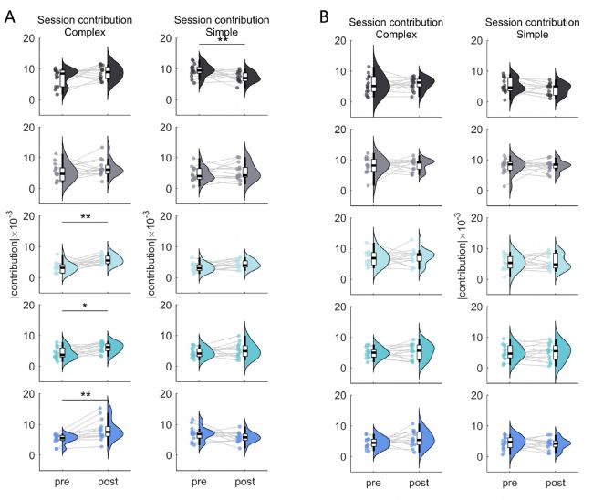 有趣的是,接受復(fù)雜動作訓(xùn)練的鋼琴家在訓(xùn)練后,表現(xiàn)出了明顯增加的獨(dú)立運(yùn)動模式比例。而進(jìn)行簡單動作訓(xùn)練的組則主要表現(xiàn)為同步運(yùn)動模式的減少。這種變化僅出現(xiàn)在訓(xùn)練過的右手(圖7 A),未訓(xùn)練的左手則沒有顯示出類似的變化(圖7 B)。這一結(jié)果揭示了一個(gè)關(guān)鍵的神經(jīng)可塑性機(jī)制:被動體驗(yàn)新的復(fù)雜動作模式可以重塑大腦皮層中手指運(yùn)動模式的編碼,強(qiáng)化手指獨(dú)立控制的能力。研究人員認(rèn)為,這一變化可能通過增強(qiáng)感覺運(yùn)動區(qū)域之間的功能連接實(shí)現(xiàn),先前的研究已表明,刺激體感神經(jīng)元能夠激活運(yùn)動皮層中的神經(jīng)元。