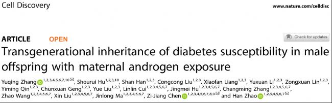 Zhang Y, Hu S, Han S, Liu C, Liang X, Li Y, Lin Z, Qin Y, Geng C, Liu Y, Cui L, Hu J, Zhang C, Wang Z, Liu X, Ma J, Chen ZJ, Zhao H. Transgenerational inheritance of diabetes susceptibility in male offspring with maternal androgen exposure. Cell Discov. 2025 Feb 12;11(1):14. pii: 10.1038/s41421-025-00769-1. doi: 10.1038/s41421-025-00769-1.