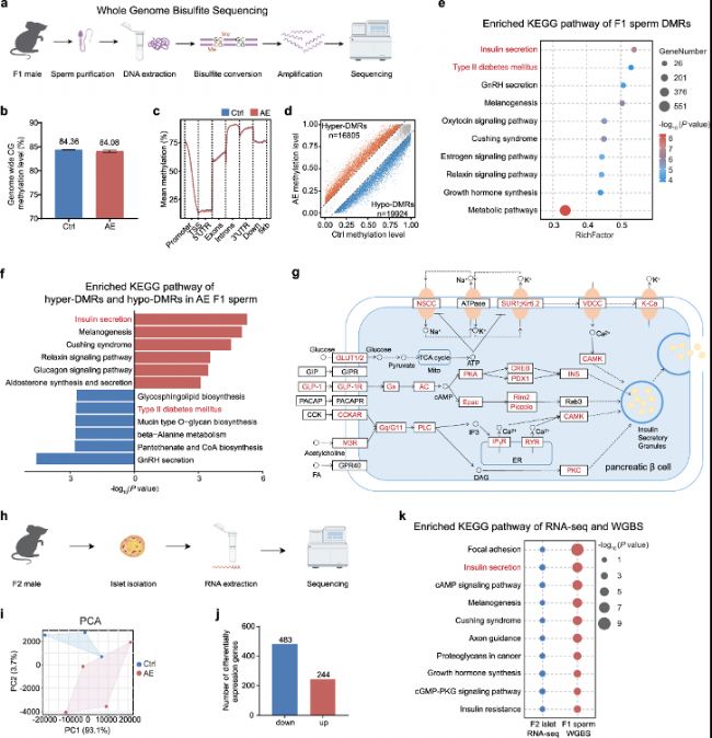 d. 在b和c中鑒定出的胰島素分泌通路中的基因列表。它詳細(xì)列出了基因功能、AE-F1精子中胰島素分泌基因的差異甲基化水平以及AE-F2胰島中基因表達(dá)變化。