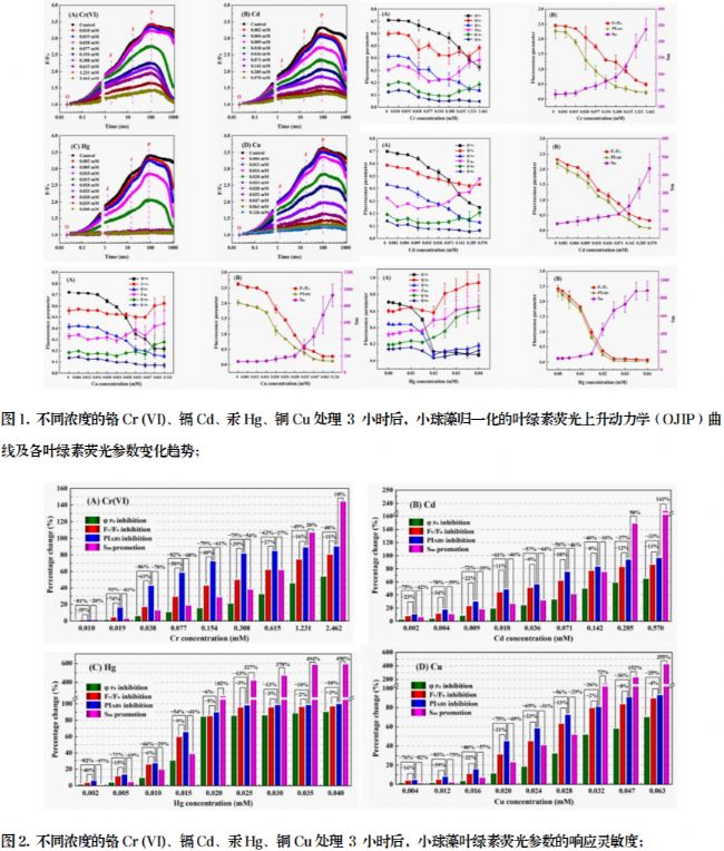 中國科學(xué)院合肥物質(zhì)科學(xué)研究院的科研人員發(fā)表的文章《A Sensitive Response Index Selection for Rapid Assessment of Heavy Metals Toxicity to the Photosynthesis of Chlorella pyrenoidosa Based on Rapid Chlorophyll Fluorescence Induction Kinetics》中,利用易科泰AquaPen葉綠素?zé)晒鉁y量儀,通過研究 4 種典型重金屬對小球藻葉綠素?zé)晒鈪?shù)的影響,篩選出敏感響應(yīng)指標(biāo)并比較重金屬毒性,為快速檢測重金屬毒性提供依據(jù)。