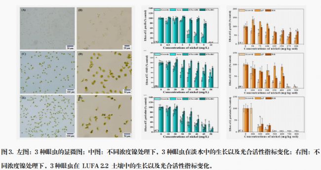 50值。其中E. gracilis對鎳污染最敏感(淡水和土壤中 EC₅₀分別為 4.8 mg/L 和 95.6 mg/kg),而E. viridis和E. geniculata可作為補(bǔ)充物種以增加測試多樣性。通過紙盤土壤法驗(yàn)證了眼蟲在土壤毒性評估中的適用性,其光合作用參數(shù)(如 qP 和 Rfd)與生長抑制顯著相關(guān),為土壤生態(tài)風(fēng)險評價提供了新方法。