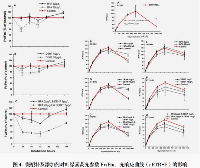 論文中葉綠素?zé)晒饧夹g(shù)主要用于揭示雙酚A(BPA)和鄰苯二甲酸二(2-乙基己基)酯(DEHP)對Alexandrium pacificum光合系統(tǒng)II(PSII)功能的動態(tài)影響。通過監(jiān)測最大光化學(xué)量子產(chǎn)量(FV/FM)和光響應(yīng)曲線(rETR-E),發(fā)現(xiàn)污染物暴露初期會顯著抑制PSII的光化學(xué)效率(FV/FM下降至對照組的60%以下),表明PSII反應(yīng)中心受損或電子傳遞受阻。然而,隨著時間推移,F(xiàn)V/FM逐漸恢復(fù)至接近或略高于對照水平,暗示細(xì)胞可能通過調(diào)整光合機(jī)構(gòu)(如增加捕光色素或修復(fù)PSII損傷)或污染物降解適應(yīng)脅迫。光響應(yīng)曲線進(jìn)一步顯示,高濃度DEHP和混合處理導(dǎo)致光飽和點(diǎn)降低和光抑制增強(qiáng),而BPA單獨(dú)處理對光適應(yīng)能力影響較小。熒光數(shù)據(jù)表明污染物通過干擾PSII功能抑制光合活性,但細(xì)胞通過生理調(diào)節(jié)實(shí)現(xiàn)部分恢復(fù)。綜合而言A. pacificum對 BPA 和 DEHP 的敏感性高于其他浮游植物物種(如硅藻和綠藻),即使在低濃度下也表現(xiàn)出生長抑制,因此可以用A. pacificum作為塑料污染的前期預(yù)警和檢測手段之一。