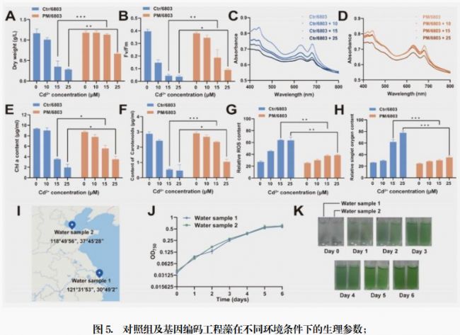 天津大學(xué)的科研人員在文章《Engineered Cyanobacteria-Based Living Materials for Bioremediation of Heavy Metals Both In Vitro and In Vivo》中利用葉綠素?zé)晒鉁y量儀AquaPen評估人工處理的工程藍(lán)藻對重金屬的耐受性和生物修復(fù)能力。在不同濃度Cd 2+(0、10、15、25 μM )處理下,PM/6803 在干重、Fv/Fm、葉綠素 a 和類胡蘿卜素含量、吸收光譜等方面表現(xiàn)出比 Ctr/6803 更好的穩(wěn)定性。通過比較不同濃度Cd 2+ 處理下野生型 Ctr/6803 和工程菌株 PM/6803 的Fv/Fm 比值(光系統(tǒng) II 最大量子產(chǎn)量),發(fā)現(xiàn) PM/6803 在較高濃度Cd 2+ 下,F(xiàn)v/Fm 仍能維持一定水平,而 Ctr/6803 的Fv/Fm 則急劇下降至接近零,表明 PM/6803 對Cd 2+ 的耐受性更強(qiáng),其光合系統(tǒng)受Cd 2+ 影響較小。同時利用葉綠素?zé)晒庠O(shè)備觀察 PM/6803 在被海藻酸鈉水凝膠包封形成 PM/6803@SA 活體材料后的生長和活力情況:隨著培養(yǎng)時間延長,PM/6803@SA 中藍(lán)藻的葉綠素自發(fā)熒光增強(qiáng),這表明包封后的藍(lán)藻能夠存活且生長狀況良好,為評估該活體材料在實(shí)際應(yīng)用中的可行性提供了依據(jù)。