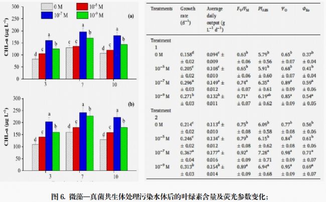 杭州師范大學(xué)在文章《Supplementation of strigolactone analog for enhancing the removal of nutrient and heavy metal by microalgae-fungi symbionts》中,研究通過向小球藻 - 綠粘帚霉共生系統(tǒng)中外源添加不同濃度 GR24,探究其對共生體生長、光合作用及去除污水中營養(yǎng)物質(zhì)和重金屬效果的影響,為微藻 - 真菌共生體在污水處理中的應(yīng)用提供依據(jù)。如上圖所示,通過使用Aquapen(AP-C 100)測量微藻—真菌共生體的光合性能參數(shù),對比不同 GR24 濃度處理下的光合性能參數(shù),發(fā)現(xiàn)隨著 GR24 濃度增加,這些參數(shù)呈現(xiàn)先升高后降低的趨勢。這說明 GR24 能促進(jìn)微藻對光的吸收,提高電子傳遞效率和最大電子傳遞產(chǎn)量,進(jìn)而提升光合作用效率。外源添加 GR24 可以顯著提高小球藻 - 綠粘帚霉共生體的光合作用和生物量,增強(qiáng)對污水中營養(yǎng)物質(zhì)和重金屬的去除效果。