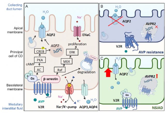 在正常情況下,AVP與V2R結(jié)合,促進(jìn)水通道蛋白2 (aquaporin 2, AQP2)向膜轉(zhuǎn)位,增加集合管對小管液水分的重吸收,從而降低血漿滲透壓并反饋性抑制AVP的合成與釋放。