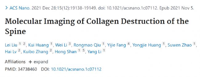 [1] Liu L, Huang K, Li W, et al. Molecular Imaging of Collagen Destruction of the Spine. ACS Nano. 2021 Dec 28;15(12):19138-19149. doi: 10.1021/acsnano.1c07112.