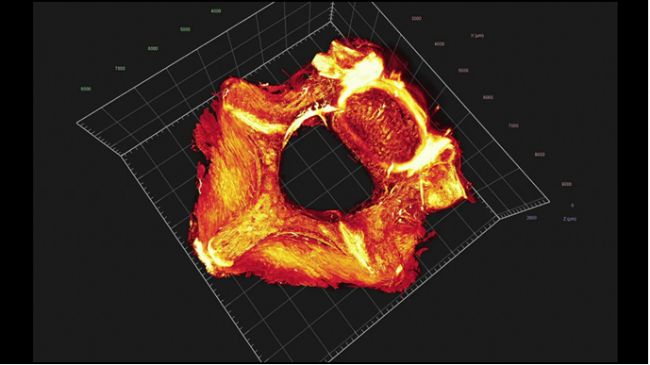 圖1 . 利用PEGASOS透明化方法對小鼠脊椎骨骼進(jìn)行透明化處理,透明化后的脊椎采用光片顯微鏡進(jìn)行拍攝,3D圖像上的明亮部分為CHP的聚集區(qū)域。