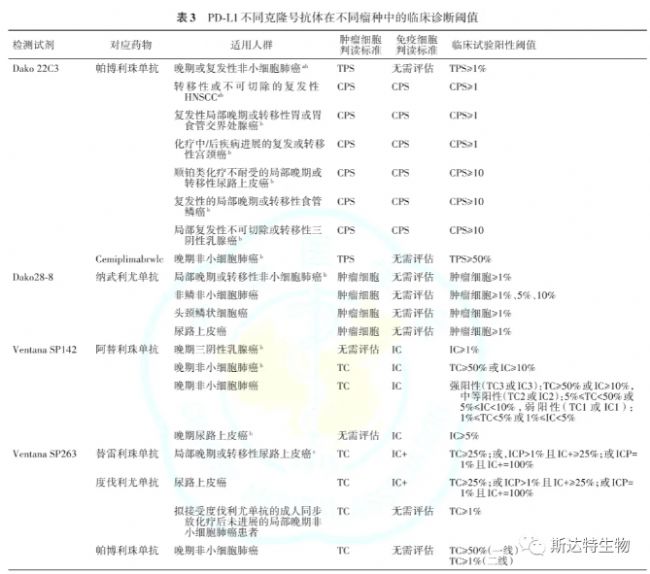 《實(shí)體腫瘤PD-L1免疫組織檢測(cè)專家共識(shí)(2021版)》對(duì)于目前使用的抗體的閾值也做出了整理說(shuō)明。