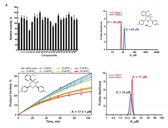 在發(fā)現的48種化合物中有22種可以直接商品化購買,隨后對其進行Msm RPR活性分析,結果顯示只有化合物 M1和M10有抑制效果,分別抑制30%和12%。同時,通過結構設計和優(yōu)化對M1進行高純度合成,對商品M1comm和合成品M1syn進行抑制常數的分析比對,兩次實驗取均值得KI值分別為49±13和17±1 μM,合成品的純度高其抑制效果更好(如圖2)。