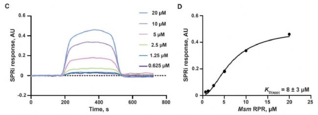 隨后對合成的M1與 Msm RPR進行表面等離子共振成像(SPRi)的結合親和力檢測,即在Plexera普芯生物具有光交聯表面化學修飾的SPRi芯片上制備微陣列,將M1及其類似物(10mM溶解于DMSO溶液)以8×8 陣列打印到芯片表面,每個化合物重復打印3次。打印后,芯片在真空黑暗環(huán)境下干燥8小時,再用 365nm紫外線照射15分鐘,然后依次用DMSO、甲醇和去離子水洗滌,并組裝到流動池中,將不同濃度的Msm RPR(0.156-20 μM)作為流動相注入流動池,進行動力學檢測,設定結合時間為300秒,解離時間為300秒,流速2μL/s。利用Plexera SPR數據分析軟件和GraphPad Prism 10進行親和力分析,發(fā)現小分子化合物M1,能夠抑制Msm RPR的活性,測得結合常數為8 ± 3 μM。