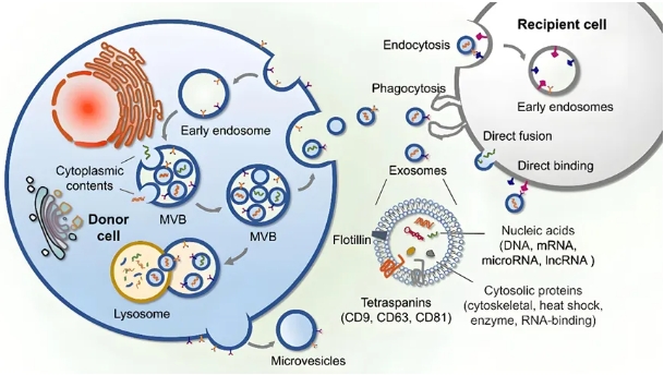細胞外囊泡根據(jù)其直徑大小可分為三種,分別為凋亡小體(50~5000 nm)、微泡(100~1000 nm)、外泌體(30~150 nm)。外泌體與細胞凋亡過程中產(chǎn)生的小囊泡不同,外泌體只能由活細胞分泌,且能被體內(nèi)多種類型細胞分泌,廣泛存在于各種體液。外泌體通過胞吞-胞吐方式由親本細胞釋放;首先,胞膜內(nèi)化形成胞內(nèi)體,胞內(nèi)體聚集形成多泡體(Mullivesicular Bodies, MVBs),MVBs與親本細胞膜融合,通過胞吐作用將外泌體排出細胞。