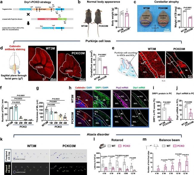 研究人員構(gòu)建了兩種小鼠模型:一種是條件性敲除Drp1基因的小鼠(PCKO小鼠),該基因的敲除會導(dǎo)致PCs發(fā)生廣泛且進行性的凋亡,進而引發(fā)小腦萎縮、共濟失調(diào)等癥狀;另一種是表達TdTomato蛋白的CBND小鼠(CBNDTdTomato小鼠),用于確保實驗穩(wěn)定性并排除免疫熒光染色的干擾。通過對這些小鼠的觀察和檢測,研究人員發(fā)現(xiàn)PCKO小鼠在3個月大時,小腦萎縮明顯,PCs數(shù)量顯著減少,同時伴有運動功能障礙和神經(jīng)膠質(zhì)細胞激活。CBNDTdTomato小鼠也呈現(xiàn)出類似的PCs退化和小腦萎縮現(xiàn)象,且運動功能在1個月大時就出現(xiàn)異常。