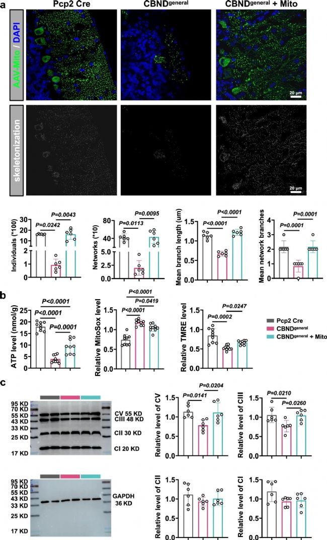 研究人員進一步深入探究線粒體移植后的作用機制。他們發(fā)現(xiàn),移植的線粒體能夠進入PCs,并在其中持續(xù)存在至少4周,且能與內(nèi)源性線粒體相互作用。同時,線粒體移植顯著改善了PCs的線粒體形態(tài)和功能,增加了ATP水平,增強了線粒體膜電位,減少了ROS生成,還緩解了Caspase3介導(dǎo)的細胞凋亡和Parkin依賴的線粒體自噬。此外,研究還發(fā)現(xiàn),缺乏DRP1或呼吸能力的線粒體無法改善CBNDgeneral小鼠的行為異常,這表明移植線粒體的功能完整性是發(fā)揮治療效果的關(guān)鍵。