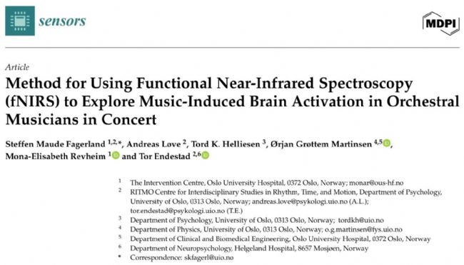 Maude Fagerland, Steffen & Løve, Andreas & Helliesen, Tord & Martinsen, Ørjan & Revheim, Mona-Elisabeth & Endestad, Tor. (2025). Method for Using Functional Near-Infrared Spectroscopy (fNIRS) to Explore Music-Induced Brain Activation in Orchestral Musicians in Concert. Sensors. 25. 1807. 10.3390/s25061807.