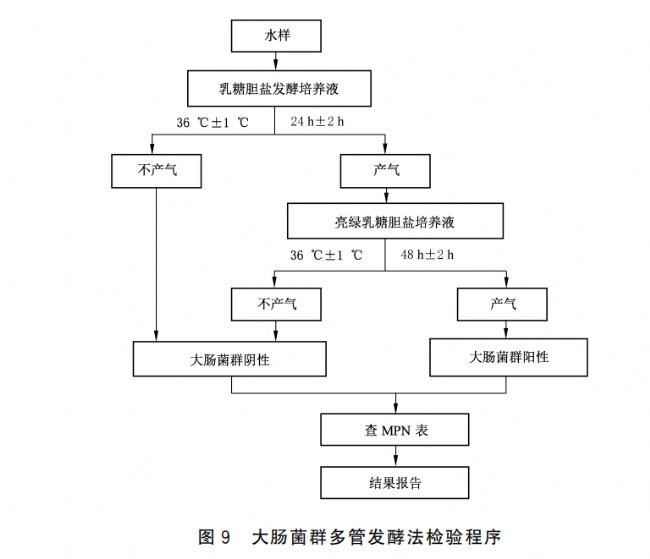 根據(jù)確證試驗證實的乳糖膽鹽發(fā)酵管反應陽性管數(shù),檢索方法對應的MPN表,報告每100 mL 樣品中大腸菌群的MPN值,以 MPN/100 mL表示。當所有接種水樣的乳糖膽鹽發(fā)酵管均為陰性反應,可報告100 mL水樣中未檢出大腸菌群。