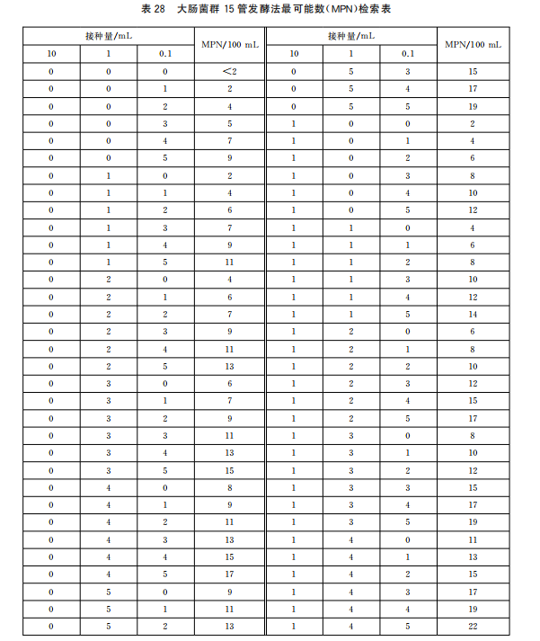 ② 觀察亮綠乳糖膽鹽培養(yǎng)液中小倒管內的產氣情況,如有氣體產生,就可確定為大腸菌群陽性,記下產氣的陽性試管數(shù),查表28可得出水樣中大腸菌群的MPN值;如無氣體產生則為大腸菌群陰性。