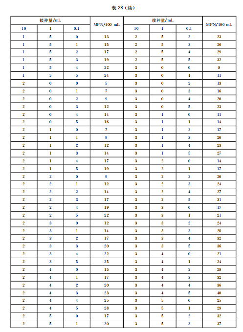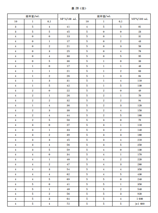 如水樣含菌量少,可按 100 mL、10 mL、1 mL 接種,實際 MPN 值應為表中的 MPN 值除以 10;如水樣含菌量多,可按1 mL、0.1 mL、0.01 mL接種,實際 MPN 值應為表中的 MPN 值乘以10,以此類推。