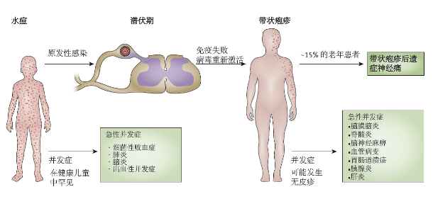 水痘帶狀皰疹病毒(VZV)在易感個(gè)體中的初次感染會(huì)導(dǎo)致水痘,通常對(duì)健康兒童來說是無害的,因?yàn)樗麄兊拿庖呦到y(tǒng)可以控制感染。VZV會(huì)在神經(jīng)節(jié)細(xì)胞中建立潛伏狀態(tài),病毒的復(fù)制和傳播到由這些神經(jīng)細(xì)胞支配的皮膚區(qū)域會(huì)導(dǎo)致帶狀皰疹。年齡增長(zhǎng)和免疫功能受損是水痘帶狀皰疹病毒感染并發(fā)癥的風(fēng)險(xiǎn)因素。然而,一些并發(fā)癥,如帶狀皰疹后神經(jīng)痛,也可以在沒有這些易感因素的情況下發(fā)生。