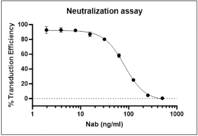 AAV2 (intact particle) Recombinant Mouse mAb (S-R435) to be tested were diluted a series of gradients (from 500ng/ml, 2 fold, 9 points) ,and each gradient was co-incubated with AAV2 virus, the mixture was infected with 293T cells after incubation, and RLU luminescence value was detected.