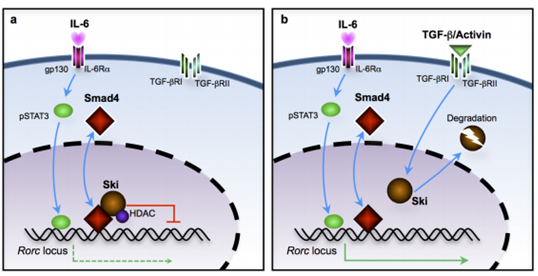 圖3. TGFβ信號破壞SKI-SMAD4復(fù)合物,以促進TH17細胞分化。