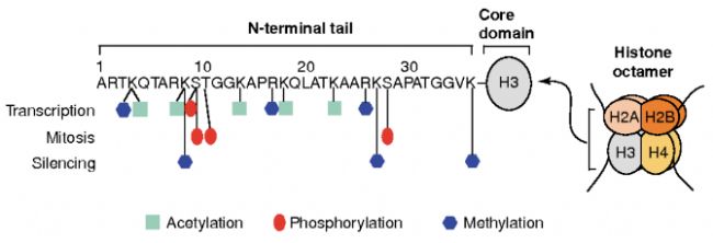 Histone H3在轉(zhuǎn)錄調(diào)控、DNA 修復(fù)與復(fù)制和染色體穩(wěn)定性中發(fā)揮核心作用。DNA的可訪問性是通過組蛋白的一系列復(fù)雜的翻譯后修飾(也稱為組蛋白編碼)和核小體重構(gòu)來調(diào)控的。