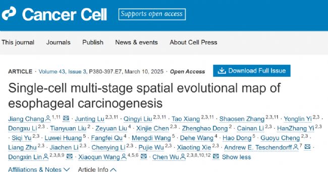 2025年3月10日,Cancer Cell以封面論文形式發(fā)表了題為 Single-cell Multi-stage Spatial Evolutional Map of Esophageal Carcinogenesis 的重要研究成果。研究團(tuán)隊(duì)扎根河南林州食管癌醫(yī)院(原姚村衛(wèi)生院),通過長期跟蹤隨訪,獲得了大量珍貴的食管癌變?nèi)^程組織樣本。在此基礎(chǔ)上,團(tuán)隊(duì)運(yùn)用前沿的單細(xì)胞空間轉(zhuǎn)錄組技術(shù),成功繪制了全球首個單細(xì)胞分辨率的食管多階段癌變“時-空 ”動態(tài)演化圖譜,實(shí)現(xiàn)了對食管癌變?nèi)^程的系統(tǒng)性解析。研究突破傳統(tǒng)腫瘤線性演化理論的局限,創(chuàng)新性地提出“癌變空間演化”理論框架,首次揭示了腫瘤相關(guān)成纖維細(xì)胞(CAF)與侵襲性上皮細(xì)胞在癌前病變階段就可形成關(guān)鍵交互生態(tài)位(CAF-Epi niche)的腫瘤演化新機(jī)制。這一關(guān)鍵生態(tài)位可作為多種鱗狀細(xì)胞癌的癌前病變進(jìn)展風(fēng)險(xiǎn)預(yù)測的重要依據(jù),不僅為系統(tǒng)解析食管癌病因和演進(jìn)機(jī)制奠定了重要理論基礎(chǔ),更為建立腫瘤早篩早診的“新林州模式”提供了科學(xué)依據(jù),對推動食管癌的早診早治具有重要的臨床實(shí)踐價(jià)值。